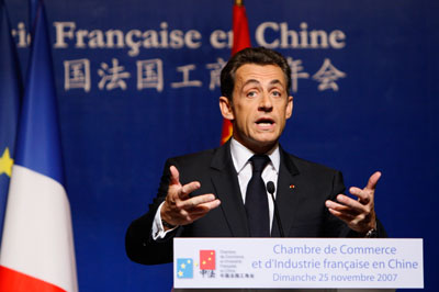 France's President Nicolas Sarkozy delivers a speech at the Franco-Chinese chamber of commerce in Beijing, on the first day of a three-day visit to China, NovemBer 25, 2007.