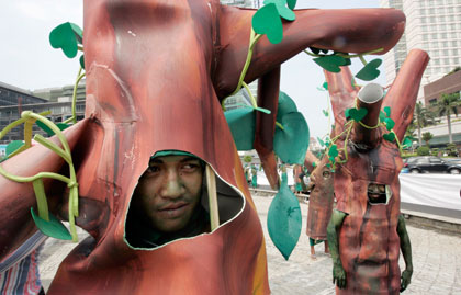 A group of Indonesian environmental activists take part in an anti-global warming campaign in Jakarta November 26, 2007. Indonesia is scheduled to host the 13th United Nations Climate Change conference in Bali to discuss the next stage in global efforts to control emissions from greenhouse gases blamed for global warming. (Agencies)