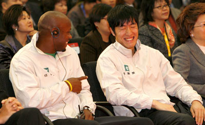 China's Liu Xiang (L), 110 metres hurdles world record holder, and Jamaica's Asafa Powell, men's 100 metres world record holder, pose during a commercial event in Shanghai December 7, 2007. (Agencies)
