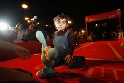 A baby sits after crossing the finishing line during a Christmas crawling race in Madrid December 13, 2007. (Agencies)