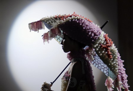 A model presents an umbrella made of condoms during a "Dress Up Against AIDS" fashion show in Kuala Lumpur December 28, 2007. More than 30 students from International Beauty & Make-Up Academy took part in the fashion show to present their creativity design outfits made out of condoms. (Agencies)