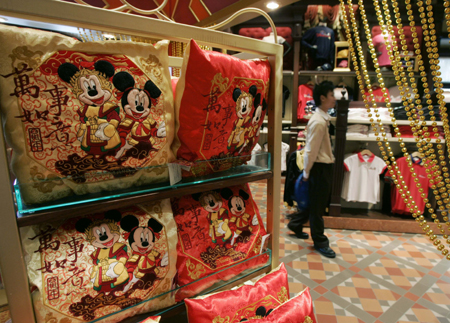 Cushions featuring Mickey Mouse are displayed at Hong Kong Disneyland January 21, 2008. The entertainment theme park promoted its "Year of the Mouse Celebration" on Monday for the upcoming Lunar Year of the Rat. (Agencies)