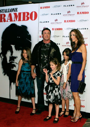 Sylvester Stallone arrives with his wife Jennifer Flavin and their three daughters at the movie premiere of "Rambo" at the Planet Hollywood Resort and Casino in Las Vegas, Nevada January 24, 2008. Stallone wrote, directed and starred in the movie. (Agencies)