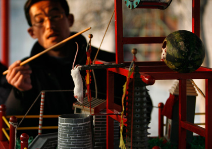 Animal trainer Guo Shutong demonstrates the skills of his trained rats during a performance at the Acrobats World in Wuqiao, Hebei province, January 29, 2008. Guo has been training rats since 1993 and performs stunts with five rats in a "rat city" made of small wooden houses connected with ropes. China will usher in the "Year of the Rat" on February 7, according to the lunar calendar. (Agencies)