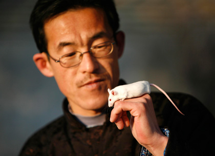 Animal trainer Guo Shutong demonstrates the skills of one of his trained rats during a performance at the Acrobats World in Wuqiao, Hebei province, January 29, 2008. Guo has been training rats since 1993 and performs stunts with five rats in a "rat city" made of small wooden houses connected with ropes. China will usher in the "Year of the Rat" on February 7, according to the lunar calendar. (Agencies)