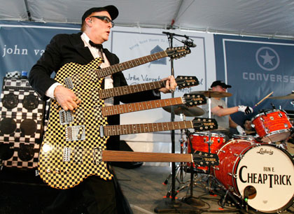 Lead guitarist Rick Nielsen performs with his band Cheap Trick at the 6th annual John Varvatos Stuart House Benefit in West Hollywood, California March 9, 2008. Stuart House is a program of the Rape Treatment Center at Santa Monica-UCLA Medical Center and serves the special needs of child victims of sexual abuse. (Agencies)