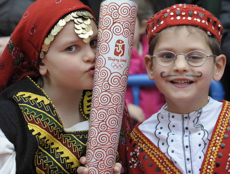 Greek children holding a torch of the 2008 Beijing Olympics pose for photographers in Giannitsa, Greece March 27, 2008. The Olympic flame travelled for the fourth day in Greece after it was lit in the site of ancient Olympia. (Xinhua)
