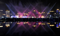 Music fountains are illuminated by colorful laser lights at the Shanghai World Expo to celebrate the National Day on Oct 1st, 2010.