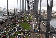 People picnic and have breakfast on the main deck of the Sydney Harbour Bridge during the Breakfast on the Bridge event in central Sydney Oct 10, 2010.