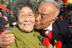 A couple enjoy cross-cup drinking during a celebration of their golden jubilee wedding anniversary ahead of the Double Ninth Festival in Jinan, East China's Shandong province, Oct 12, 2010.