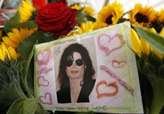 A card with a photograph of late entertainer Michael Jackson is placed among flowers during an event to commemorate the first anniversary of his death, in Leipzig, June 25, 2010.