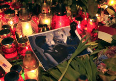 A photograph of Poland's late President Lech Kaczynski and his wife Maria is surrounded by candles and flowers near the presidential palace in Warsaw April 11, 2010.