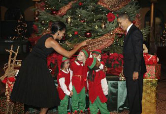 First lady Michelle Obama introduces children her husband and U.S. President Barack Obama as they attend the Christmas in Washington Celebration at the National Building Museum in Washington December 13, 2009.