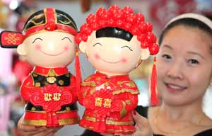 A woman holds up a pair of ornaments for Qixi, otherwise known as Chinese Valentine's Day, in Bozhou, Anhui province, August 11, 2013.