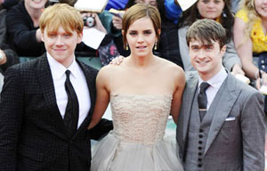 Actress Emma Watson poses with fellow cast members Daniel Radcliffe and Rupert Grint as they arrive for the world premiere of "Harry Potter and the Deathly Hallows: Part 2" at Trafalgar Square in London July 7, 2011.