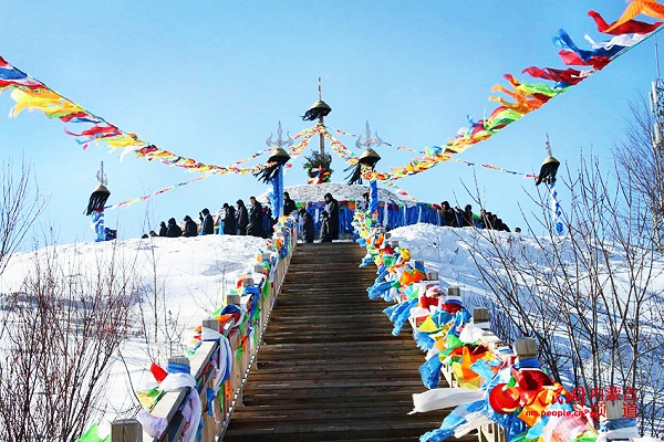 Chanting sutras, Mongolian herdsmen gathered around a cone-shaped mound called Aobao to sacrifice livestock and libation, praying to the spirits for peace and harvest in Arxan on Feb 23.