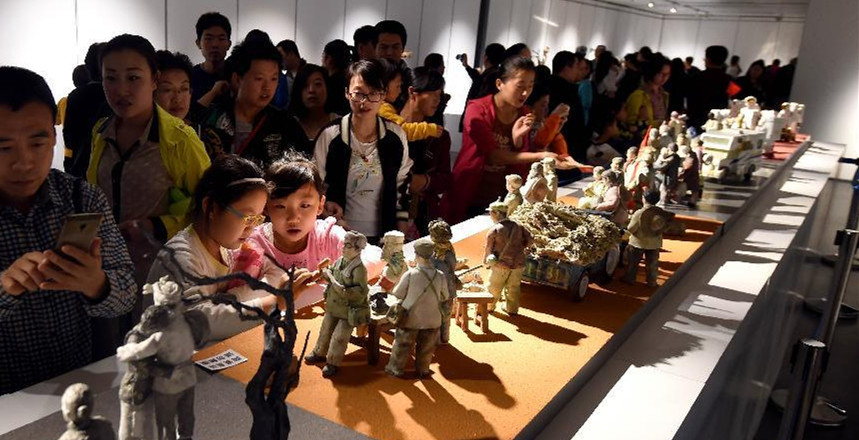 People visit a sculpture exhibition, as part of the 12th National Exhibition of Fine Arts held at Taiyuan Gallery in Taiyuan, north China's Shanxi province, Oct. 3.