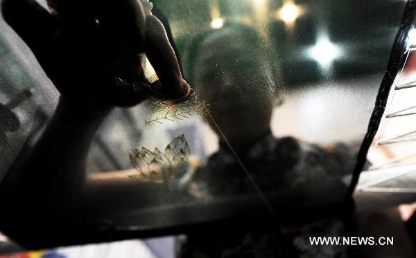 A craftswoman demonstrates embroidery skills during the national non-material cultural heritage exhibition in Tianjin, north China, Sept. 29, 2010. The exhibition, which kicked off here on Wednesday, presented more than 70 items of China's non-material cultural heritage. (Xinhua/Yue Yuewei)