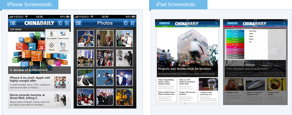 產品融會文本、圖像和音頻、視頻等多媒體呈現方式,第一時間展示《中國日報》媒體集團主報、海外子報及網站的主要實時資訊。其中獨家原創的視頻欄目是及時展現中國動態的一個重要渠道。