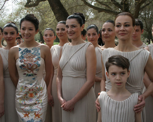Chinese actress Zhang Ziyi (front left) poses with Greek priestesses for a group photo at the flame-lighting ceremony for Beijing Olympic Games in Olympia, Greece, March 24, 2008. [qq.com]