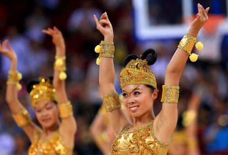 Cheerleaders perform during the men's preliminary round group B basketball match China vs. Greece at the Beijing Olympic Basketball Gymnasium on August 18, 2008. China lost 91-77 to Greece. [sina.com.cn]