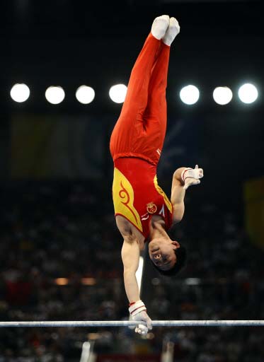 China's Zou Kai competes in the men's horizontal bars final of the artistic gymnastics event of the Beijing 2008 Olympic Games in Beijing on August 19, 2008. China's Zou Kai won the gold, United States' Jonathan Horton the silver and Germany's Fabian Hambuechen the bronze. [Agencies]