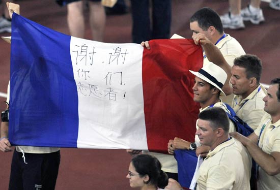 French delegation hold their national flag with Chinese characters " Thanks to volunteers"  during the closing ceremony of the Beijing 2008 Paralympic Games at the National Stadium September 17, 2008.[Xinhua]