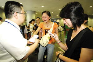 An airport worker [L] talks with passengers whose flights are canceled or delayed for the heavy rain at Capital International Airport in Beijing July 31, 2007. [Xia Yong/Beijing Times]