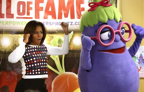 US first lady Michelle Obama (2nd R) talks to children about vegetables at a La Petite Academy child care center in Bowie, Maryland, Feb 27, 2014. Obama made the visit to highlight the commitment that the parent company, Learning Care Group, has made to the child care best practices in her Let's Move! Initiative for children's health. [Photo/Agencies] |