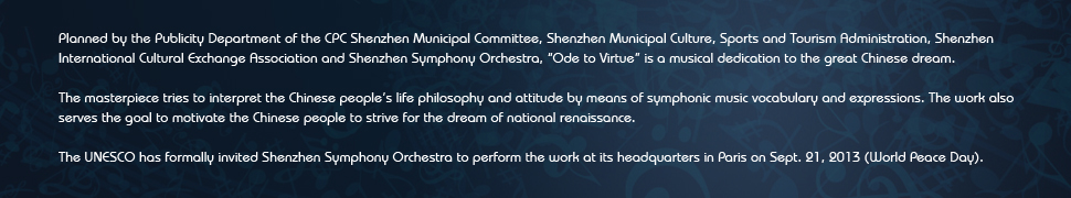 Ode to Virtue is a symphony in five movements focusing on the core Confucian values of ren, yi, li, zhi and xin - benevolence, righteousness, propriety, wisdom and faithfulness.
