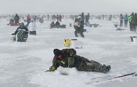 Thousands of eager anglers prepare for the best spot as the worlds largest ice fishing contest kicks off in Minnesota. More than 10,000 people will brave Baltic conditions and make the trip to Brainerd, Minnesota, US, to take part in the annual Brainerd Jaycees Ice Fishing Extravaganza. The meeting is the biggest of its kind in the world and offers a tempting cash prize of around $150,000 to the champion. The three hour event attracts huge crowds of spectators who pile on to the two square mile competition site despite blistering temperatures of less than minus 40 degrees. [Photo/icpress.cn] |
