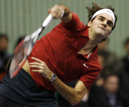 Roger Federer of Switzerland serves during an invitational exhibition tennis match against Pete Sampras of the U.S. in Seoul November 20, 2007. Federer won the match. [Agencies]