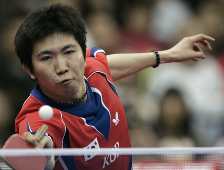 South Korea's Ryu Seung-min returns a shot to Japan's Kaii Yoshida during the men's semi-finals of the World Team Table Tennis Championships in the southern Chinese city of Guangzhou March 1, 2008. [Agencies]
