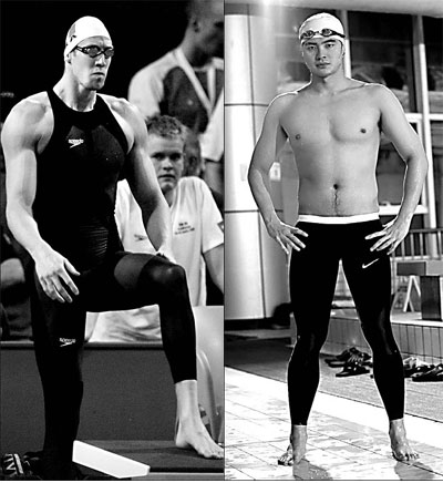 Left: Alain Bernard of France, who wears Speedo's new LZR Racer bodysuit broke three world records during the European Swimming Championships in Eindhoven, the Netherlands, last month. Right: China's Olympic medal hopeful Wu Peng poses with his new Nike suit after setting a national record in the men's 200m butterfly during the National Swimming Championships in Shaoxing, Zhejiang province, on Monday. [China Daily/Agencies]