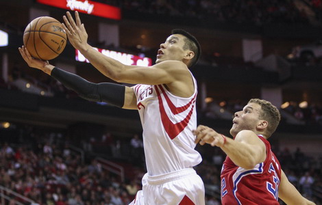 Houston Rockets point guard Jeremy Lin (7) drives the ball to the basket during the first quarter as Los Angeles Clippers power forward Blake Griffin (32) defends at Toyota Center. [Photo/Agencies] |