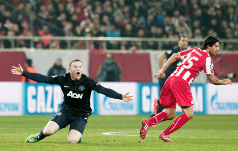 Manchester United's Wayne Rooney (L) reacts during their Champions League round of 16 first leg soccer match against Olympiakos at Karaiskaki stadium in Piraeus, near Athens, February 25, 2014. [Photo/Agencies] |