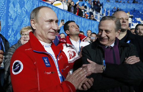 Winner Canada's Alex Bilodeau (L) and his brother Frederic celebrate with the Canadian flag after the men's freestyle skiing moguls competition at the 2014 Sochi Winter Olympic Games in Rosa Khutor February 10, 2014. [Photo/Agencies] |