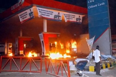 burned a gas station, buses and several cars. Another mob pelted security forces