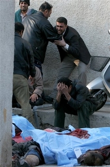 Prime Minister Nouri al-Maliki, a member of Iraq's Shiite majority, condemned the attack and blamed it on Sunni extremists and supporters of Saddam Hussein. The coordinated attack in Tayaran Square involved a suicide attacker who drove up to the day laborers pretending to want to hire them, then set off his explosives as they got into his minibus, Lt. Bilal Ali said. At virtually the same time - 7 a.m. - a bomb exploded in a car parked some 30 yards away. The blasts shattered storefront windows, dug craters in the road and set fire to about 10 other cars. At least 57 Iraqis, including seven policemen, were killed and 151 people were wounded, Ali said. He said most of the victims were Shiites from poor areas of the capital such as Sadr City. Iraqis gather on the square early in the morning, soliciting jobs as construction workers, cleaners and painters. They buy breakfast at stands selling tea and egg sandwiches while they wait for potential employers to drive up. Khalil Ibrahim, 41, who owns a shop in the area, was treated at a hospital for shrapnel wounds to his head and back. "In the first explosion, I saw people falling over, some of them blown apart. When the other bomb went off seconds later, it slammed me into a wall of my store and I fainted," he said. Police at a nearby checkpoint fired random shots in several directions. Residents rushed to the devastated area to see if friends or relatives had been killed or wounded.