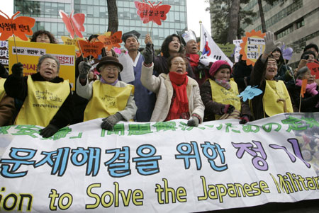 a protest in front of the Japanese embassy in Seoul March 7, 2007. Japanese