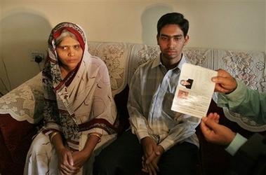 Qurrath ul Ain, left, mother of Muhammad Haneef, an Indian doctor sits with her younger son Mohammed Shuaib, right, as a family member holds the passport of Ain with a valid Australian visa stamped on it, at their home in Bangalore, India, Friday, July 6, 2007. Police launched fresh raids Friday in connection with the failed terrorist plot in Britain, seizing computer files and other material from two hospitals in western Australia, the federal police chief said. Haneef was detained in Australia on Monday. [AP]