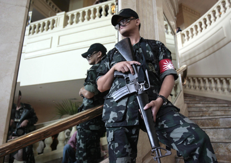 The soldiers, numbering around 30, were accompanied by armed guards as they broke down a door of the hotel, overwhelmed security guards and read out a statement against Arroyo with a full list of their demands.