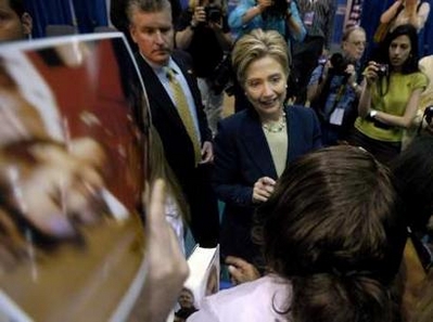 Democratic U.S. presidential candidate Senator Hillary Clinton (D-NY) signs autographs after addressing a campaign rally at Methodist University's Riddle Center in Fayetteville, North Carolina, April 24, 2008. [Agencies] |