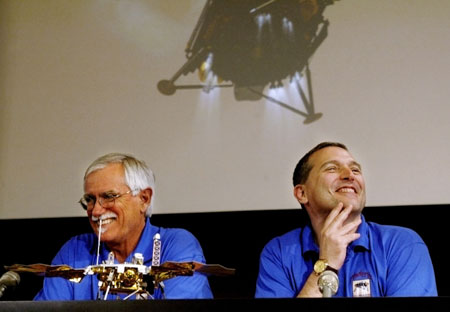 Phoenix Mars Lander principal investigator Peter Smith (L) of the University of Arizona and JPL project manager for NASA's Phoenix Mars Lander Barry Goldstein smile, as animation video of the Phoenix Mars Lander landing is shown, during a media briefing at the Jet Propulsion Laboratory in Pasadena, California May 25, 2008, after the spacecraft landed safely on Mars near its north pole. [Agencies]