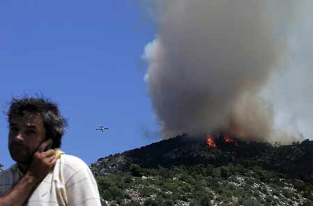 A fire-fighting airplane unloads water behind a man during a forest fire in the village of Kalamos, north of Athens June 20, 2008. [Agencies] |