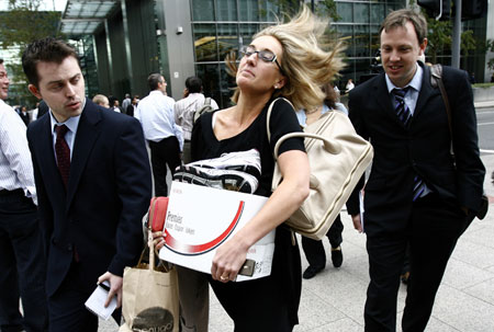 A worker carries her belongings after clearing her desk at the London office of the U.S. investment bank Lehman Brothers in Canary Wharf, London on September 15, 2008. Global markets plummeted on Monday after investment bank Lehman Brothers filed for bankruptcy protection, rival Merrill Lynch agreed to be taken over and the Federal Reserve threw a life line to the battered financial industry. [Agencies]
