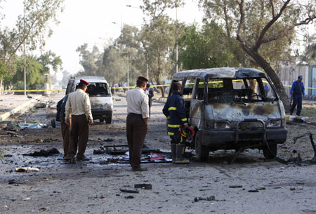 Burnt vehicles are seen on a road after bomb attacks at a police academy in eastern Baghdad December 1, 2008. An apparently coordinated car bomb and suicide bomb attack at Baghdad's police academy killed at least 30 people on Monday, police said. [Agencies]