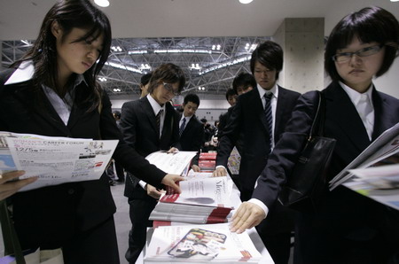 Job-seekers pick up brochures at a job fair held for graduates in Tokyo November 15, 2008. University students in the world's second-largest economy could face a rude awakening as the global financial crisis hits Japan, prompting firms to cut graduate recruitment. [Agencies]