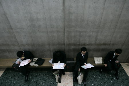 Job-seekers rest on a bench at a job fair held for graduates in Tokyo November 15, 2008. University students in the world's second-largest economy could face a rude awakening as the global financial crisis hits Japan, prompting firms to cut graduate recruitment. [Agencies]