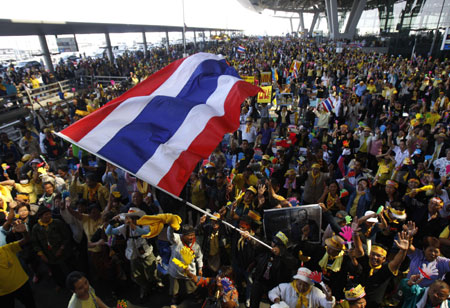 The rulings raised the risk of clashes between red-shirted government allies, who rallied outside the court as the verdict was read out, and thousands of the yellow-shirted anti-government protesters blockading the capital's two airports. There was no immediate reaction to the court verdict from the People's Alliance for Democracy (PAD), who invaded Bangkok's two main airports last week in a "final battle" to topple Somchai. The PAD had refused to negotiate until Somchai was gone. They accuse Somchai of being a puppet of his brother-in-law, ousted Prime Minister Thaksin Shinawatra. Around 250,000 foreign tourists have been stranded by the week-long sit-ins at Don Muang and the bigger Suvarnabhumi international airport. The air cargo industry has ground to a halt, costing the country hundreds of millions of dollars. However, airport officials said they hoped to resume cargo flights from Suvarnabhumi later on Tuesday, a welcome sight for a tourist- and export-dependent economy already suffering from the global financial crisis.